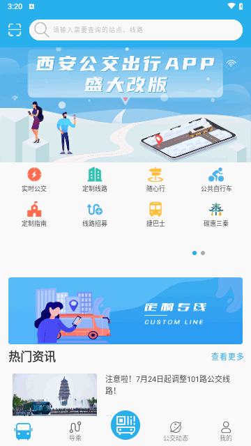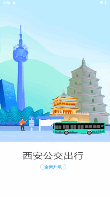 1、市民在手机中搜索后,可以看到西安公交出行APP的图标为一辆卡通版公交车,点击下载后打开APP首页,用户可以看到蓝色的主界面以及上方的搜索栏。