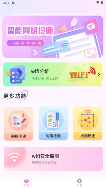 万能wifi网速是一款提供WiFi网络测速工具的软件,在软件中用户可以对WiFi网络速度进行一键测速操作,快速掌握当前网络的网速情况,对当前的WiFi网络进行分析诊断,便于用户了解当前WiFi网络的详情状况,让用户能够在一个网络畅通的环境下轻松上网使用,对WiFi网络进行安全监测,方便用户能够安全上网。
