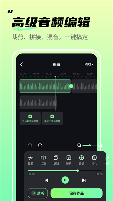 音频剪辑君app集成了各种音频编辑和处理的基本功能,可以处理各种音频格式,包括常见的MP3、WAV、AAC等,以及一些更专业的音频格式,用户们不用担心文档不兼容,非常实用。还在等什么?有需要的朋友们一定不能错过,快来下载吧。