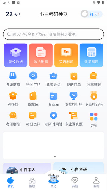 1、下载安装好研小白app安卓版后即可运行使用,其中主要为用户们提供了首页、研友圈、院校、调研、我的五大模板;
