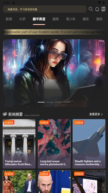 躺平英语APP是由杭州威行科技有限公司所开发打造的一款十分不错的在线英语学习软件,这里为大家准备了非常丰富的英语文章资讯、新闻,当你可以来这里自由阅读,无论你是四六级、雅思托福还是考研等,这款软件都可以满足大家的学习需求。