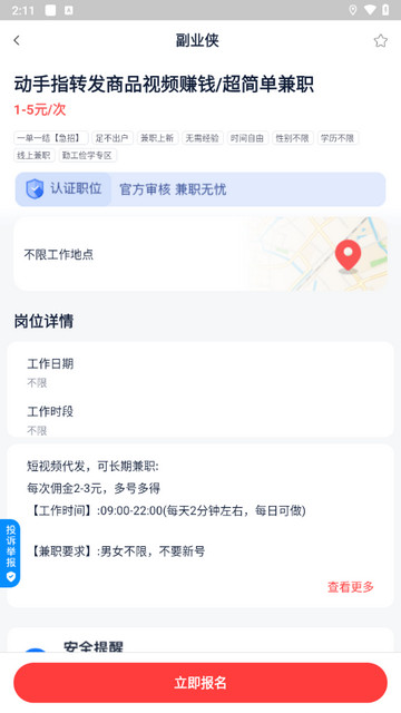 副业侠是一款优质的手机兼职软件,该软件为用户提供了丰富的兼职工作信息,各种兼职工作岗位都能在这里找到,让你能够在空闲时间通过兼职赚取零花钱,并且平台内的兼职信息都经过严格审核,确保其信息真实可靠,让你能够在这里放心的找工作。