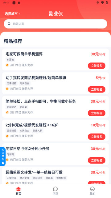 副业侠是一款出色的网上兼职软件,覆盖全国300+城市以及65万+的企业集团,为用户提供超多的高薪职位,让求职者的就业变得更加简单。同时,副业侠app提供了很多按照时薪进行的岗位推荐,很适用于有闲暇时间的用户兼职赚点外快。