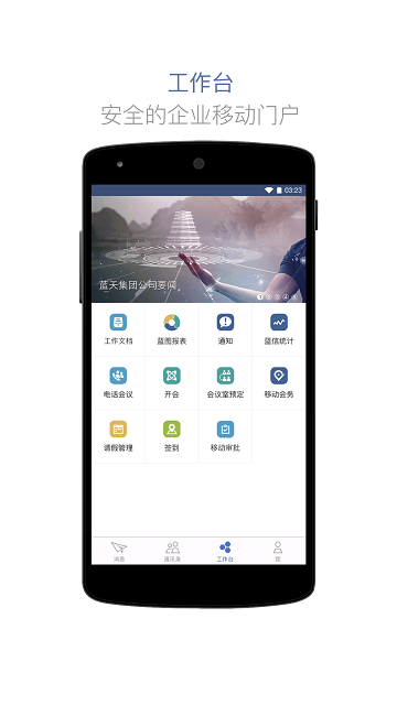工作台:安全对接组织的独立应用及业务系统,打造移动工作统一入口。