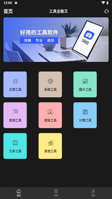 工具全能王APP是由广州飞磨科技有限公司所开发打造一款专业、高效、免费的手机工具,这里所汇集的工具非常全面,包含了日常、系统、图片、查询、提取、计算、文本以及其他工具,不管是日常生活还是工作上都可以适应不同用户的使用需求。