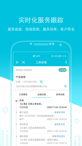 实时查看服务人员的当前位置、行程轨迹及工单的完成进度。