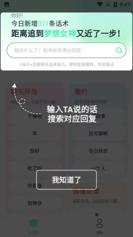 2、让你们轻松互动,一键搜索各种话术,让你们的聊天更有趣,值得体验。