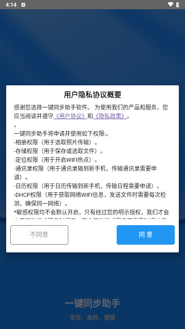 一键同步助手App这款传输服务软件带给用户们最好的服务,软件中没有任何的限制的,多种文件传输功能绝对的能够让用户们特别的满意,可以通过软件对手机的各种联系人、图片、文件、视频、通讯录等进行一键快速传输,让许多更换手机的用户以后可以一键时间数据备份,需要的朋友们快来下载吧。