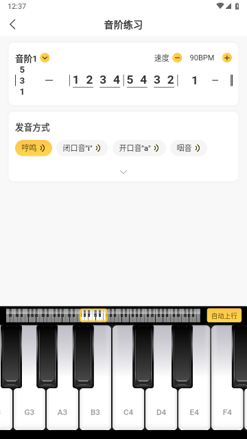 2、智能辅助练习功能:练习页面支持五线谱、简谱展示,方便用户对照学习。底部配备可发声琴键,辅助用户更高效地练习歌唱及发声。提供音阶训练功能,支持自定义音阶,用户可以根据需求进行个性化练习。