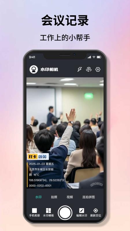 4、具备实时定位功能,可自动获取用户当前位置信息并添加到水印中,方便用户进行现场打卡、实地勘探等工作记录。