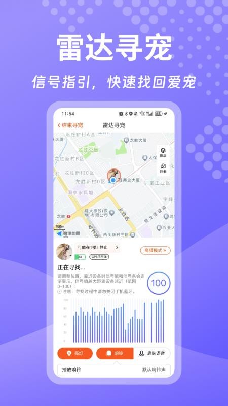 3、内置声光寻宠模式,通过控制宠物佩戴设备发出声响和闪光,在夜晚或复杂环境中快速定位。