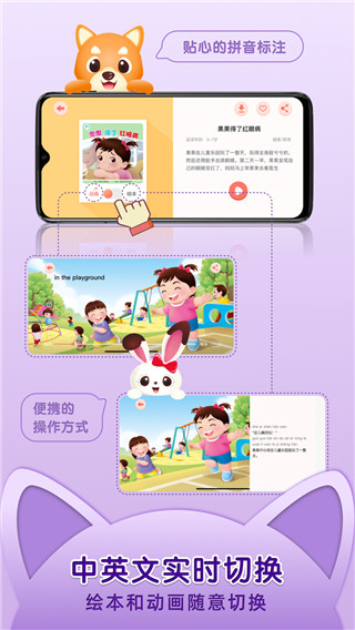 1、拥有海量中英双语故事绘本,孩子进入后可直接学习,在阅读中接触两种语言,潜移默化培养双语能力,为语言学习奠定基础。