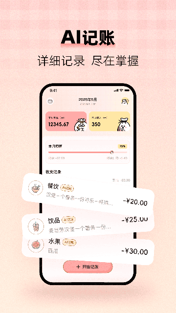 2.智能分类:AI自动识别消费场景,精准归类账单(如餐饮、交通、购物等),支持自定义标签。
