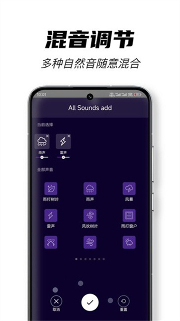 3、混音创造独特体验:自由混音功能是该软件的突出亮点,用户可以发挥创意,将不同音效组合在一起,获得独一无二的助眠声音体验。