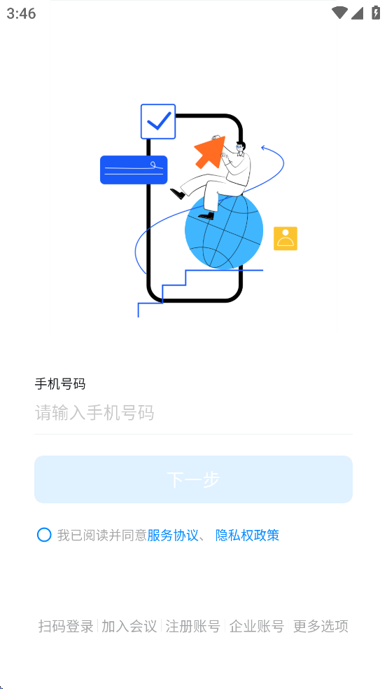 1、在温馨提示弹窗中点击【同意】,确认遵守《服务协议》和《钉钉基本功能隐私权政策》。
