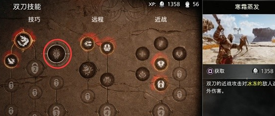 3、初期在雪地里,我们优先点双刀的技能,这是因为很多敌人的血条是冰冻的,所以我们更多使用双刀。