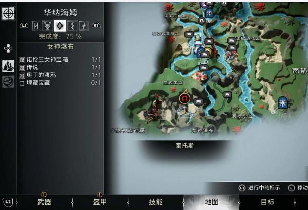 宝藏的位置在华纳海姆-女神瀑布,如图所示位置可以找到宝藏护身符附魔-尼福尔海姆美德。