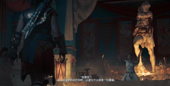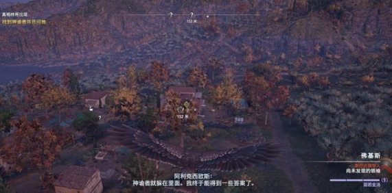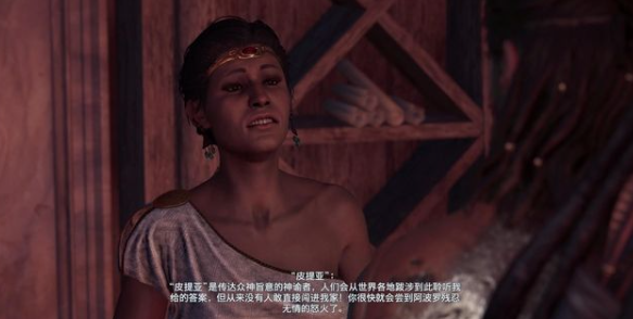 2、进去遇到神谕者皮提亚,触发对话。然后前往城郊借助老鹰找到皮提亚。