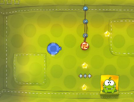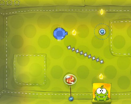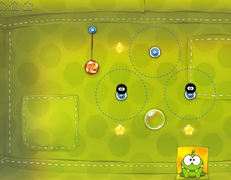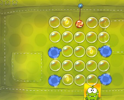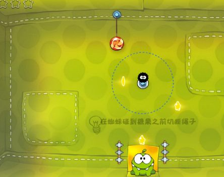 剪断绳子后掉进气泡,然后利用气垫依次接近星星并吃掉,最后在下面同样利用气垫即可吃到糖果。