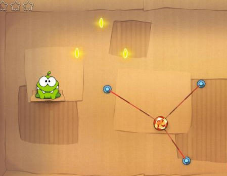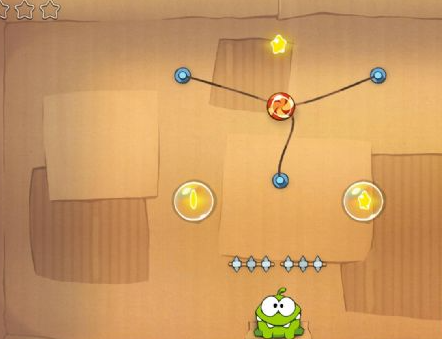 先将左下方的绳子割断吃到中间的星星,然后割断右下方的绳子吃上面的星星,然后将剩下的绳子全部割断。