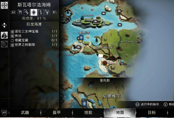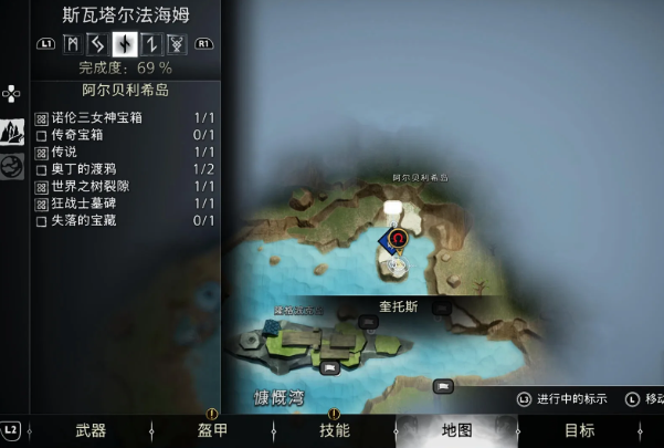 藏宝图位于斯瓦塔尔法海姆 - 阿尔贝利希岛,拿到长矛之后就可以到达对岸找到藏宝图-冲到岸边。