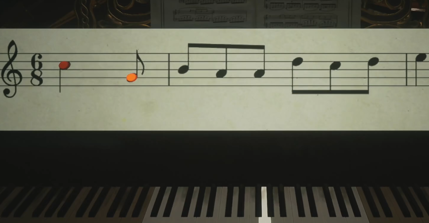 18、视角右转,走进去,然后上二楼,再进入音乐厅弹奏钢琴拿到铁纹钥匙。