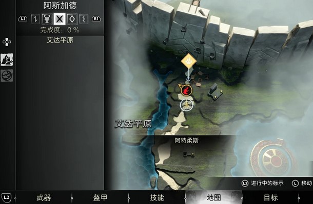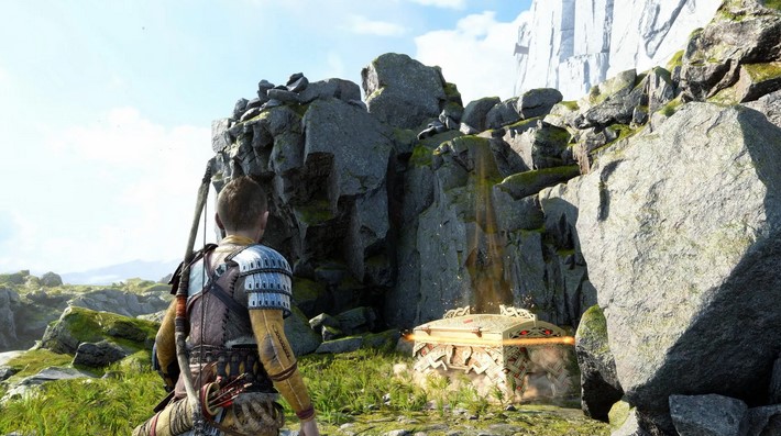 1、阿特柔斯关卡,来到阿斯加德艾达平原,使用元素连锁爆炸通过篝火点燃植物,在下图位置就可以找到传奇宝箱,打开后可以获得弓能力“分裂魔符”。