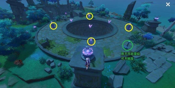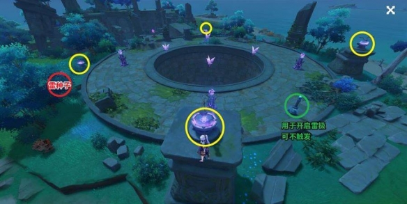 2、召唤雷种子,站在雷霆探针与雷柱中间,让雷霆探针正对雷柱,使雷霆探针归位,归位4个雷霆探针解锁雷柱。