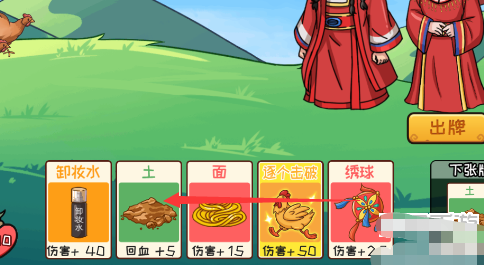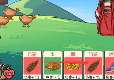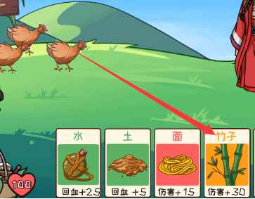 1、第一步将两个竹笋放一起变成竹子,然后把鸡拖拽到竹子上获得逐个击破。