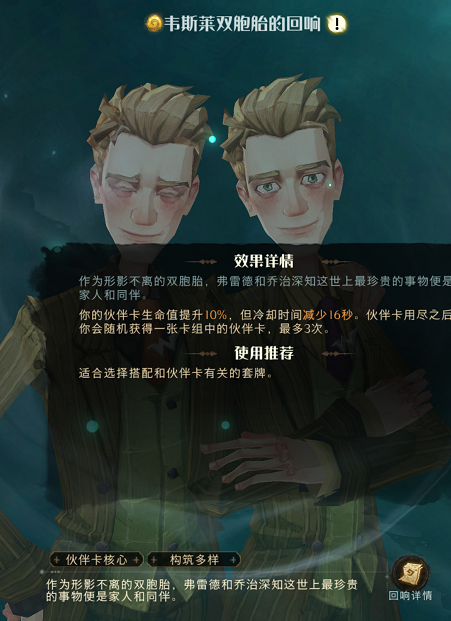 动作格斗哈利波特魔法觉醒中的韦斯莱双胞胎回响非常厉害,可以得到额外三张卡组中的任意一个,并且伙伴卡生命值高10%,非常的好用,接下来小编就为大家介绍韦斯莱双胞胎图鉴,希望对你有帮助。