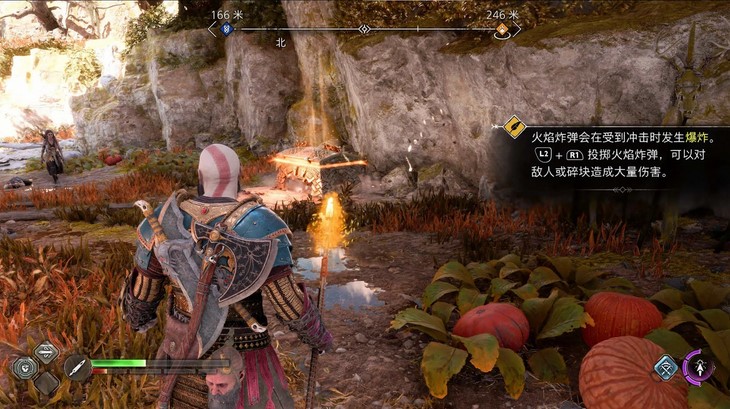 2、探索该区域找到被黄色晶体包裹的宝箱及火焰炸弹。