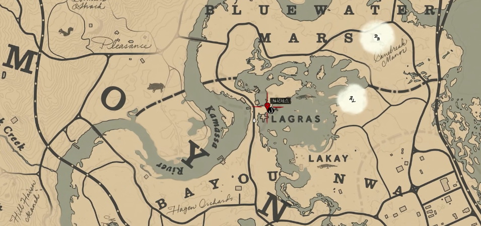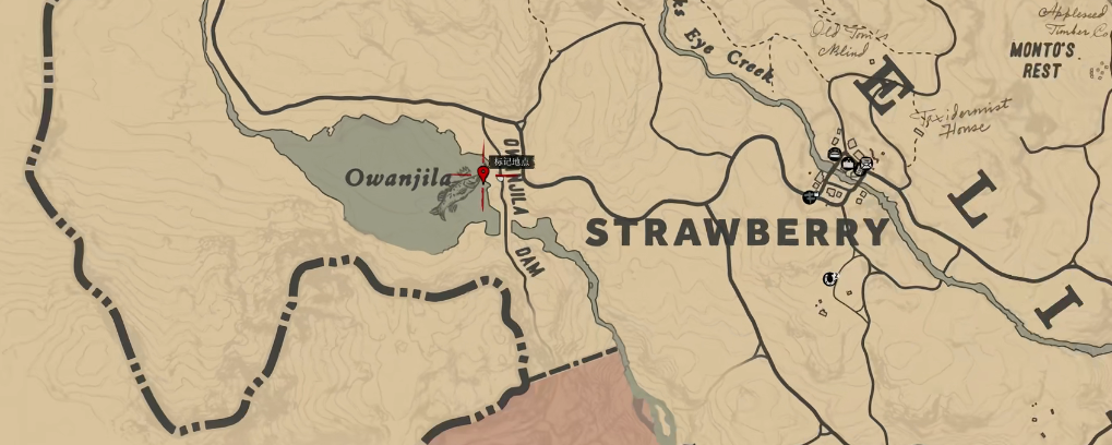 5、之后前往草莓镇西侧的欧万吉拉湖边,如图所示标点的位置,这里刷新传说小口黑鲈。