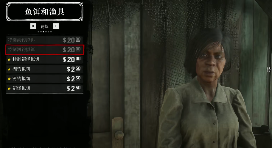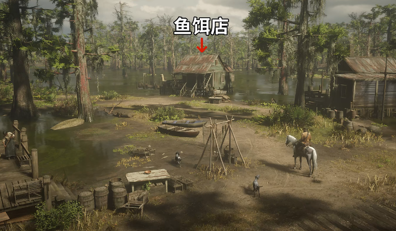 4、到达后我们前往如图所示标记的小屋,这个小屋是一个鱼饵店,在鱼饵店内我们将所有拟饵和鱼饵都买完。