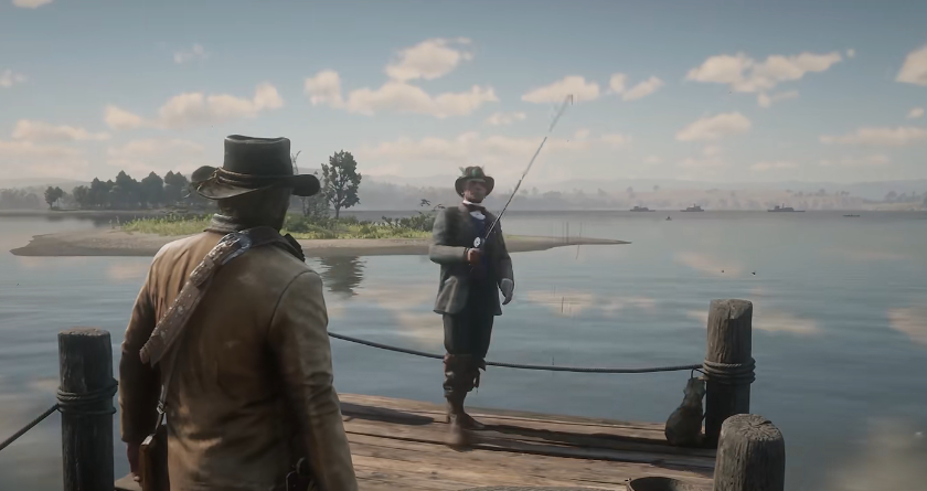 2、来到码头后可以看到码头上有一个钓鱼的NPC,我们上前与其对话就可以触发天生钓手的传说鱼任务。