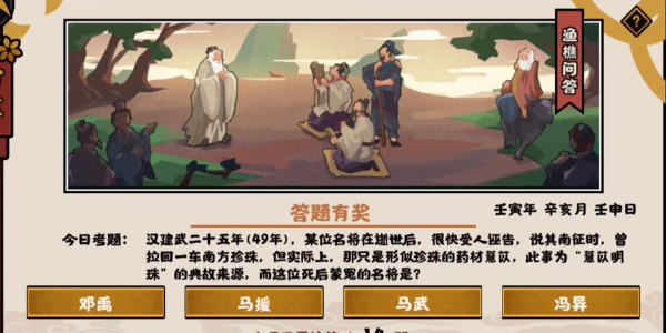 今日考题:汉建武二十五年(49年),某位名将在逝世后,很快受人诬告,说其南征时,曾拉回一车南方珍珠,但实际上,那只是形似珍珠的药材薏苡,此事为“薏苡明珠”的典故来源,而这位死后蒙冤的名将是?