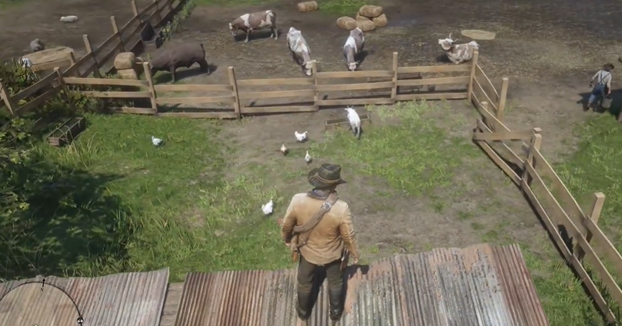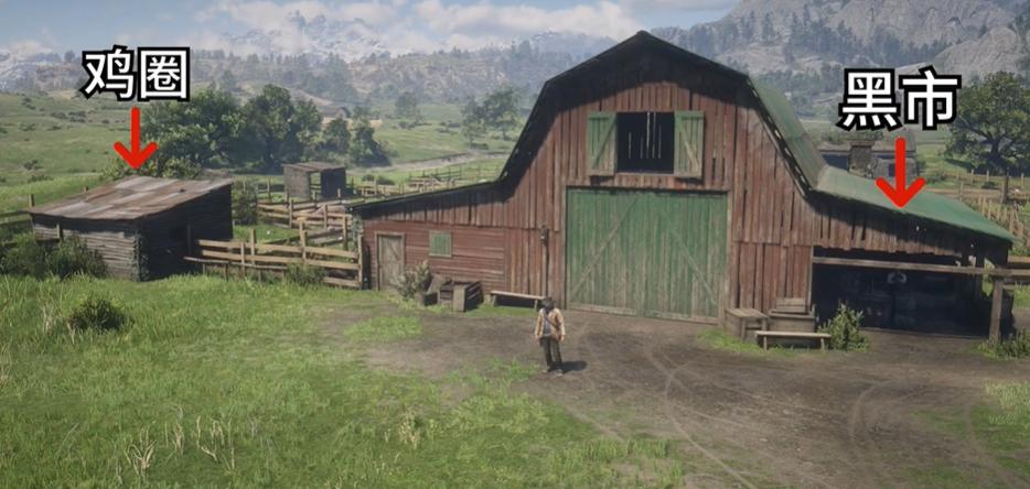 2、然后找到如图标记所示的鸡圈,并跳到鸡圈的鸡舍上。
