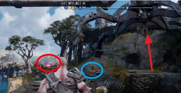 5、攻击两下图中箭头指示的装置,然后用混沌之刃过去。左边的宝箱,用同样的办法过去。旁边可以放下捷径,从入口处可以直接爬到这里。然后沿着山道爬上去。