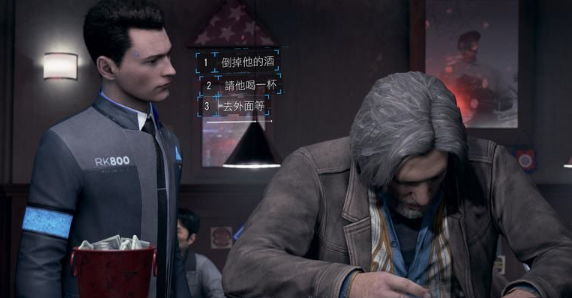 1、康纳接到命令协助汉克调查仿生人案件,前往酒吧,吧台第二个长头发大叔就是汉克。