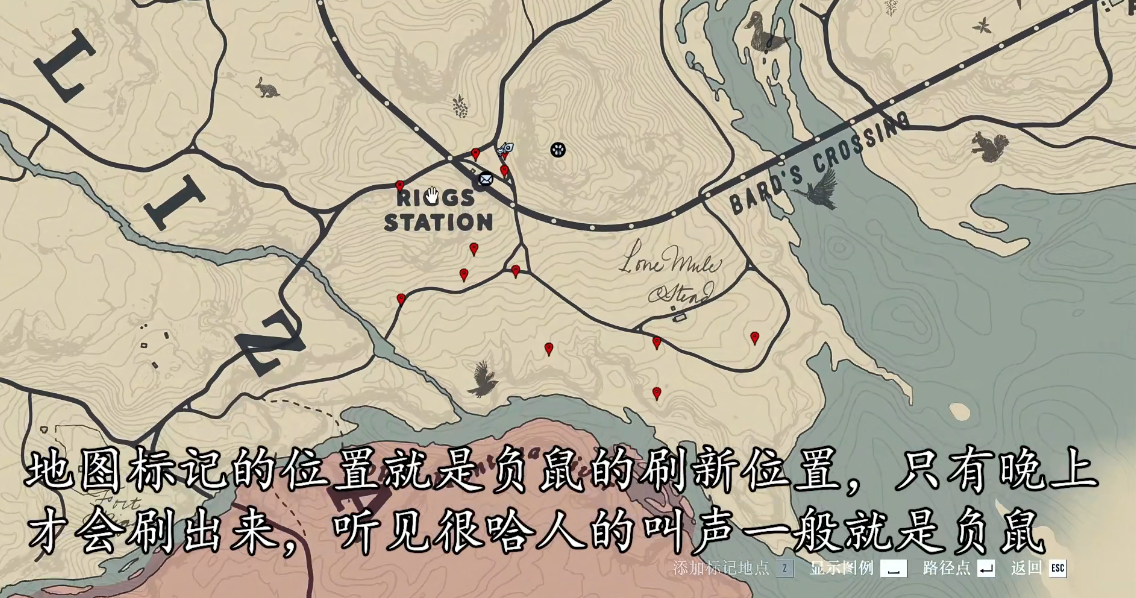 1、如图所示标点位置是负鼠的刷新地,负鼠晚上才会出来,如果听到和其他动物不一样的吼声,那一般就是负鼠。