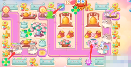 3、空出的位置放置魔法球和鱼刺,继续开中间,萝卜附近放置烟花。