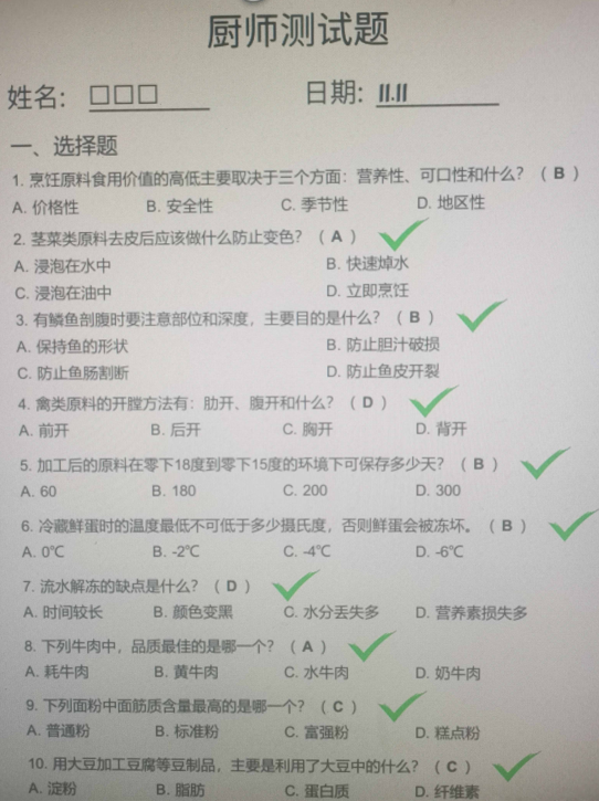 6.冷藏鮮蛋时的温度最低不可低于多少摄氏度,否则鲜蛋会被冻坏。( B )