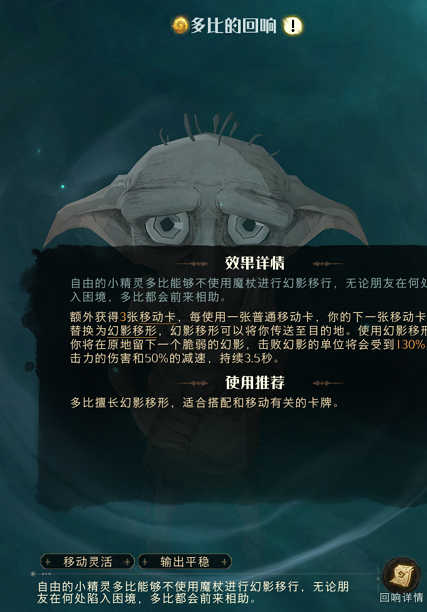 效果: 自由的小精灵多比能够不适用魔杖进行幻影移形,且额外会多出三张移动卡,每使用一张普通移动卡,你的下一张移动卡将会替换成幻影移形,幻影移形可以将你传送至目的地。使用幻影移形后,你将留下一个脆弱的幻影,击败后幻影的单位将会收到130%的攻击力的伤害和50%的减速,且持续3.5秒。 |