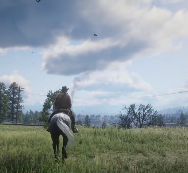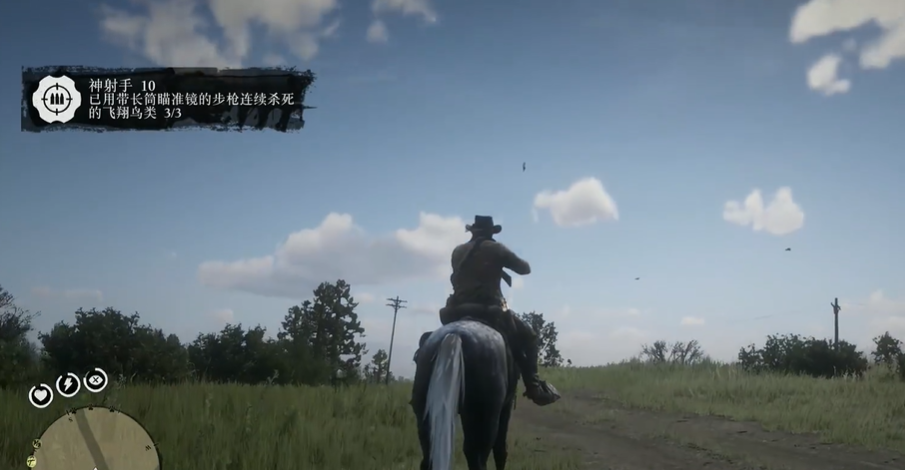 3、可以看到天上飞着几只秃鹫,这些秃鹫飞行速度慢而且身体比较大,很容易击中,我们拿出滚轮闭锁式步枪连续击杀3只秃鹫即可完成挑战。