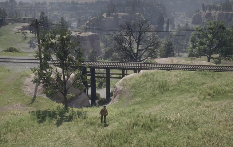 2、到达后站在如图所示的位置,这边是一座小铁路桥,桥的下方挂着一具尸体,这里的尸体旁会固定刷出5只秃鹫。