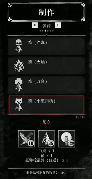 制作一支炸裂箭、火焰箭、改良箭、毒箭和小型猎物箭。