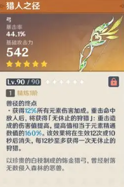 精炼(1/2/3/4/5)阶 兽径的终点 获得(12%/15%/18%/21%/24%)所有元素伤害加成。重击命中敌人后,将获得「无休止的狩猎」:重击造成的伤害值提高,提高值相当于元素精通数值的(160%/200%/240%/280%/320%)。该效果将在生效12次或10秒后消失,每12秒至多获得一次无休止的狩猎。 |
