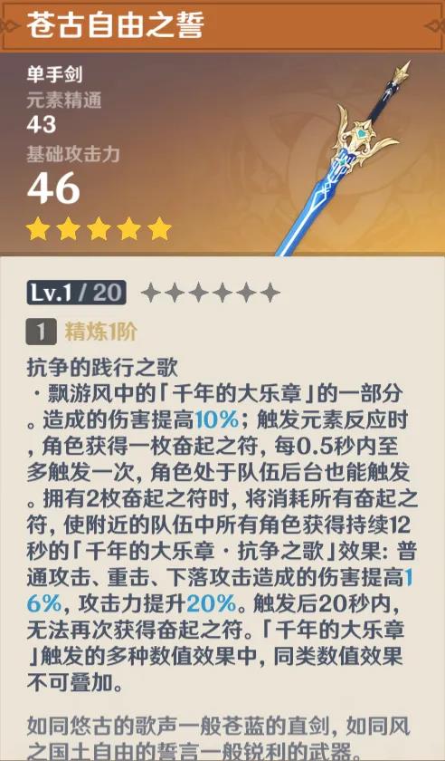 精炼(1/2/3/4/5)阶 抗争的践行之歌 飘游风中的「千年的大乐章」的一部分。造成的伤害提高(10%/12.5%/15%/17.5%/20%); 触发元素反应时,角色获得一枚奋起之符,每0.5秒内至多触发一次,角色处于队伍后台也能触发。 拥有2枚奋起之符时,将消耗所有奋起之符,使附近的队伍中所有角色获得持续12秒的「千年的大乐章·抗争之歌」效果: 普通攻击、重击、下落攻击造成的伤害提高(16%/20%/24%/28%/32%),攻击力提升(20%/25%/30%/35%/40%)。触发后20秒内,无法再次获得奋起之符。 「千年的大乐章」触发的多种数值效果中,同类数值效果不可叠加。 |