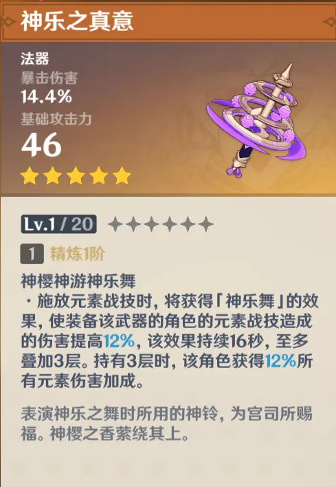 精炼(1/2/3/4/5)阶 神樱神游神乐舞 施放元素战技时,将获得「神乐舞」的效果,使装备该武器的角色的元素战技造成的伤害提高(12%/15%/18%/21%/24%),该效果持续16秒,至多叠加3层。 持有3层时,该角色获得(12%/15%/18%/21%/24%)所有元素伤害加成。 |