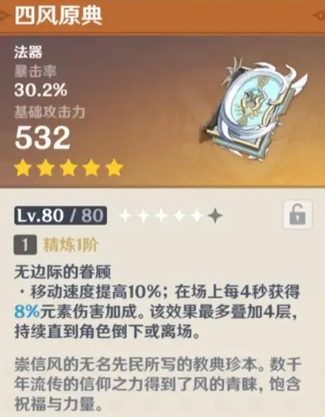精炼(1/2/3/4/5)阶 无边际的眷顾 移动速度提高10%;在场上每4秒获得(8%/10%/12%/14%/16%)元素伤害加成。该效果最多叠加4层,持续直到角色倒下或离场。 |