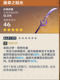 精炼(1/2/3/4/5)阶 非时之梦·常世灶食 攻击力获得提升,提升程度相当于元素充能效率超出100%部分的(28%/35%/42%/49%/56%),至多通过这种方式提升(80%/90%/100%/110%/120%)。 施放元素爆发后的12秒内,元素充能效率提升(30%/35%/40%/45%/50%)。 |